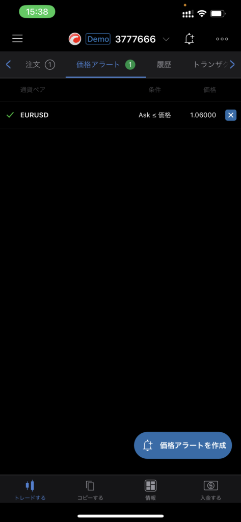 メインメニューの[価格アラートを作成]か、画面左下の[価格アラートを作成]ボタンをタップ→通貨ペアを選択→ASKかBIDで条件を指定→設定する価格[以上]か[以下]で作動するかを指定(※)→価格を入力→必要に応じてコメント入力可能→[価格アラートを作成]