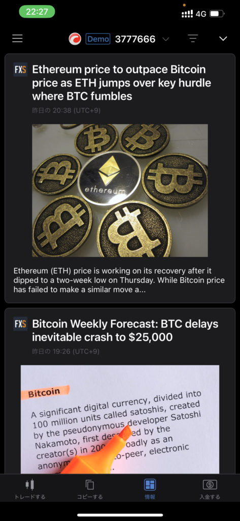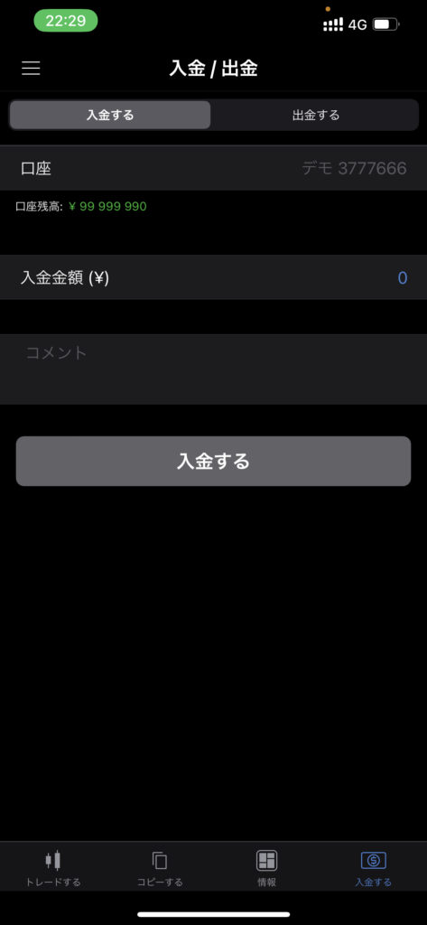 DEMO口座では、資金額の調整ができます。[入金金額]に任意の金額を入力し、[入金する]をタップするとその額面が残高に反映されます。