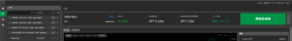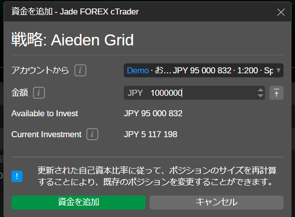 - 取引口座から割り当てた資金は、ストラテジー取引口座に移動され、戦略への投資を開始できました。