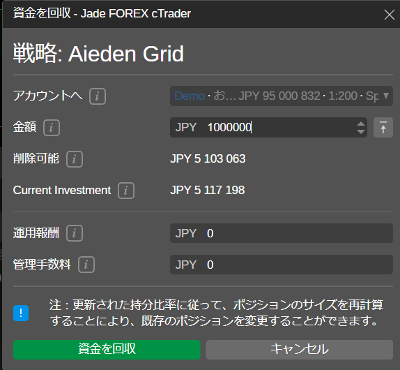 コピートレーディング口座から資金を出金する場合、証拠金比率に応じてポジションサイズを再計算するため、既存のポジションが変化することがあります。