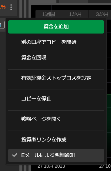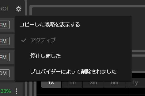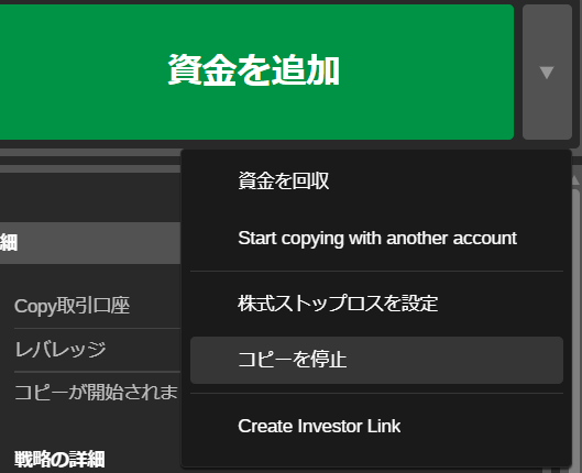 - コピーを停止するには、コピーリスト右側の[︙]をクリックし、[コピーを停止]を選択するか、ストラテジーメニューの右上にある[資金を追加]ボタンの隣にある「▽」から[コピーを停止する]を選びます。