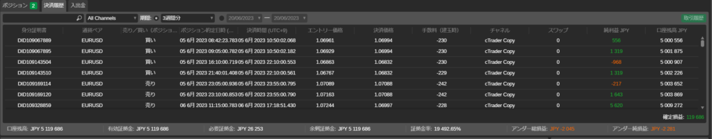 [決済履歴]テーブルには、ストラテジーのコピー中に注文を満たした、または満たそうとしたすべての取引がリストアップされます。