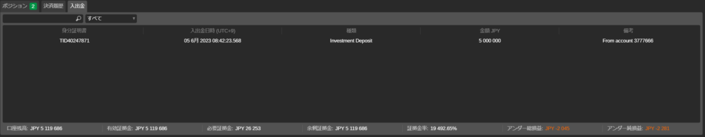 ポジション、決済履歴、入出金の表