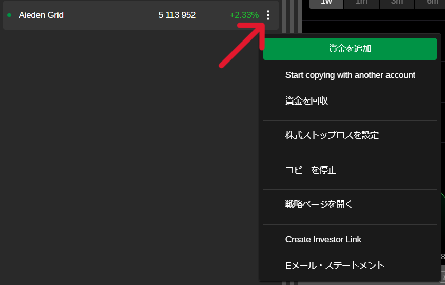 - コピー取引口座に資金を追加するには、コピー取引口座プレビューの右側にある [︙] ボタンをクリックし、ドロップダウンから [資金を追加] を選択します。