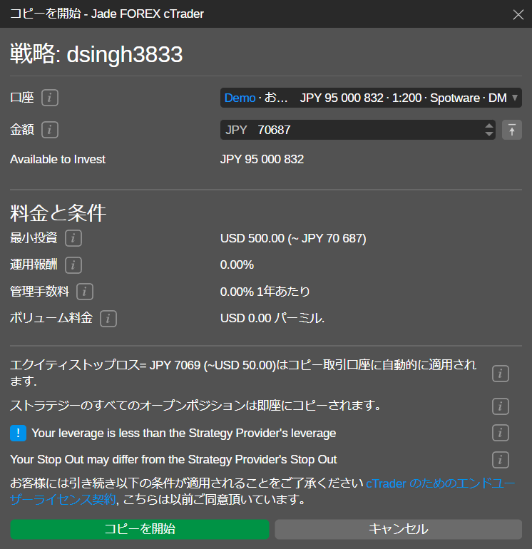 ここにはストラテジーをコピーする際の投資額や手数料などの基本情報が表示されます
