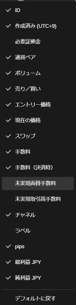 「未実現両替手数料」列を有効にするには、いずれかの列見出しを右クリックし、ドロップダウンで 「未実現両替手数料」 をチェックします。