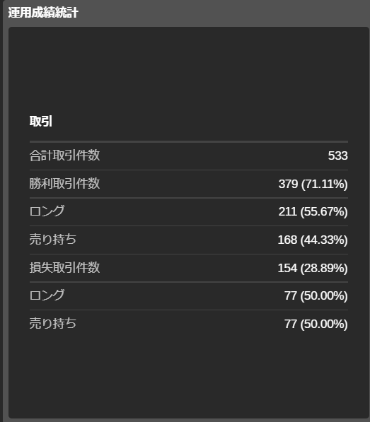 フィルターの下には、「全取引」「ロング取引」「ショート取引」の区分で、以下の取引統計が表示されます