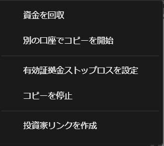 - 有効証拠金ストップロスを設定するには、コピーリスト右側の「▽」をクリックし、ドロップダウンから「有効証拠金ストップロスを設定」を選択します。