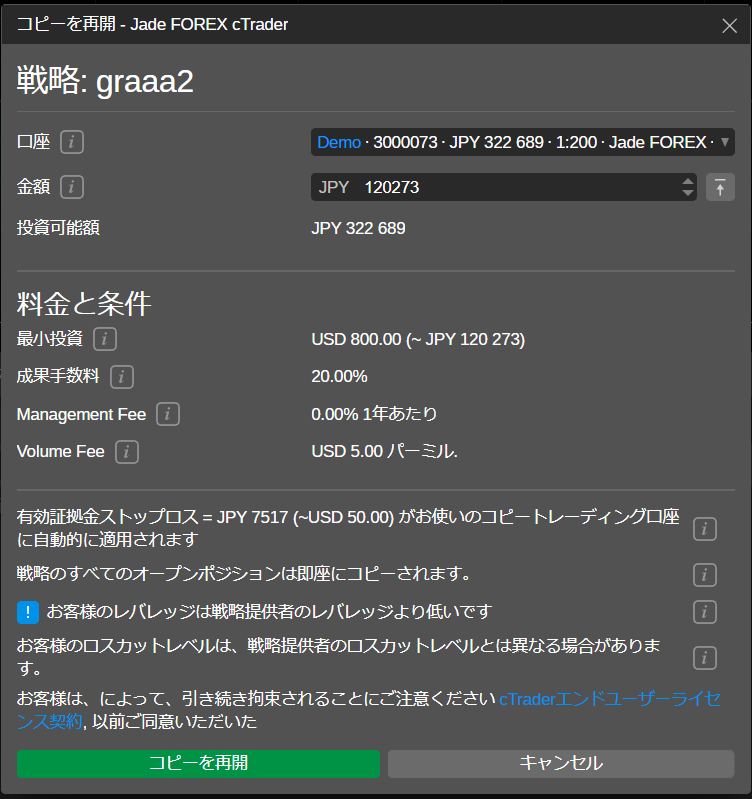 「コピーを再開」フォームがポップアップ表示されます。コピー取引口座に十分な資金がある場合は、「コピーを再開」をクリックすれば、コピーが再開されます。
