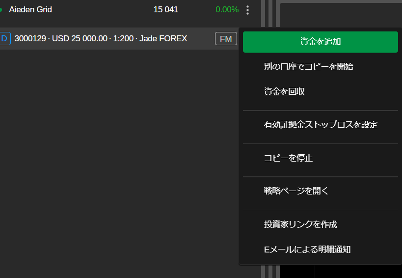 ストラテジーをコピーしている間にも、コピー取引の口座は管理することが可能です。資金の追加や削除、ストップエクイティロスの設定や削除、コピーの停止などができます。