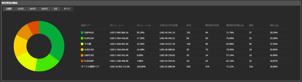 [取引数量の動向]の円グラフは、取引されたシンボル、それぞれの取引量、そしてストラテジーを通して、このシンボルで取引された総量に対する割合を表示します。