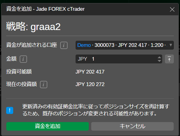 コピー取引口座に資金を追加する場合、株式比率に応じてポジションサイズを再計算するため、既存のポジションが変更される可能性があることに注意してください。