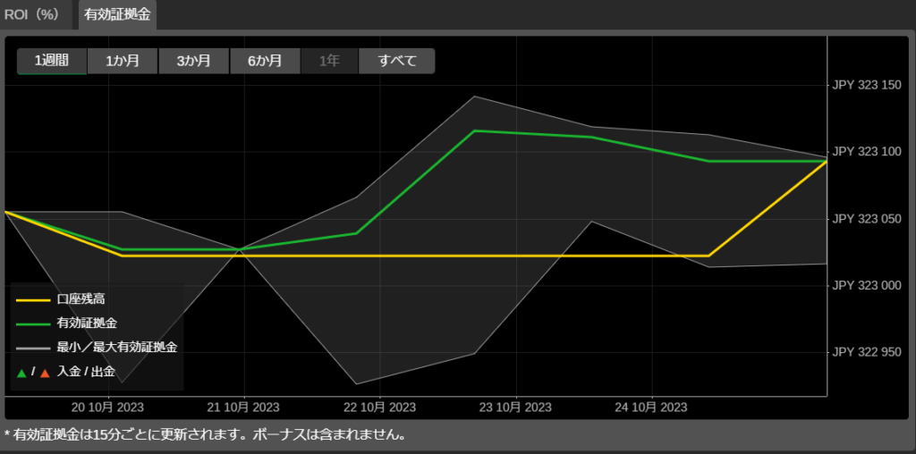 [有効証拠金]チャートでは、X軸に時間、Y軸に金額が表示されます。このチャートは、選択した期間中の口座残高に対するコピー取引口座の有効証拠金の変化を示しています。