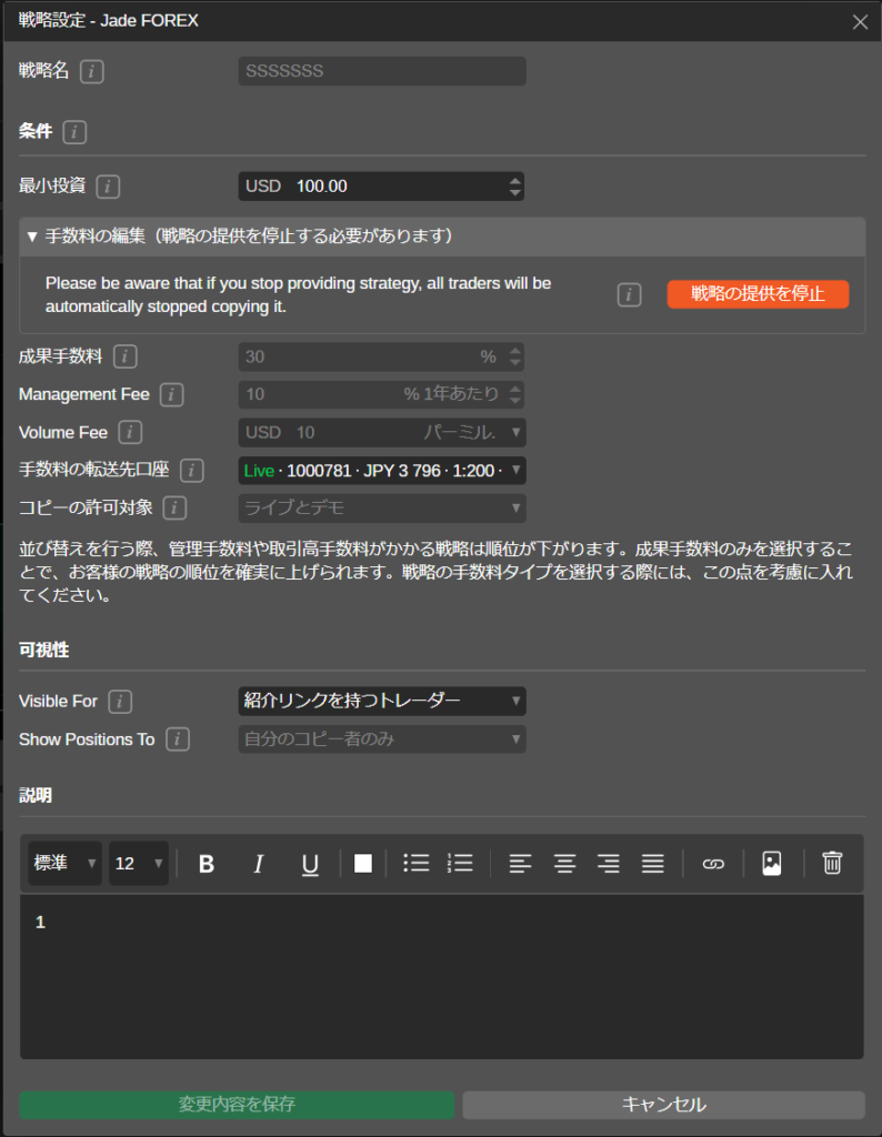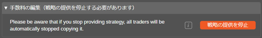 必要な手数料を編集し、[変更内容を保存]をクリックします。戦略の提供を停止すると、すべてのフォロワーに対しコピーが停止されますので注意してください。