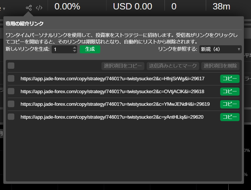 2.の場合では、一度限りのプライベートリンクを持つ人のみがストラテジーをフォローすることができます。