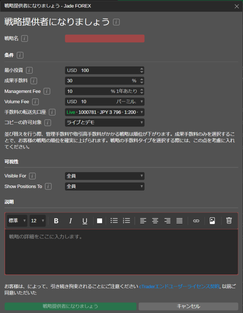 cTrader アカウントを持つすべてのトレーダーは、戦略プロバイダーとなり、取引戦略を共有し、投資家から手数料を得ることができます。