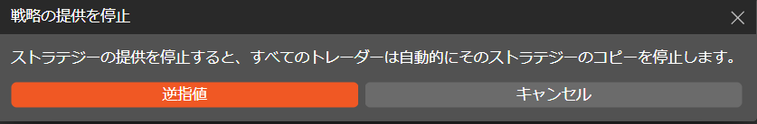 ストラテジーの提供を停止すると、すべてのインベスターは自動的にそのストラテジーのコピーを停止し、ストラテジー内のすべてのオープンポジションがフォロワーのために自動的にクローズされます。