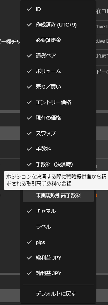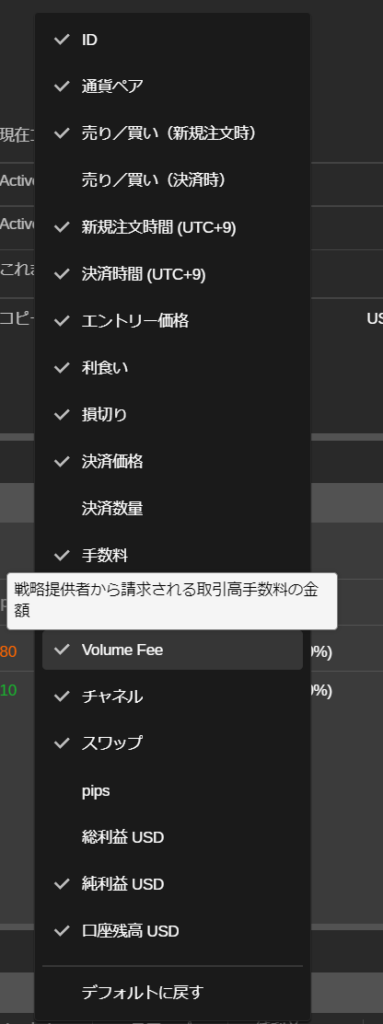 Volume Fee(出来高手数料)と未実現出来高手数料の列は、デフォルトでは無効になっています。列の見出しを右クリックし、ドロップダウンから追加したい列を選択します。