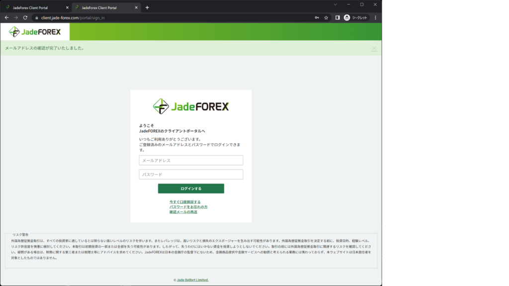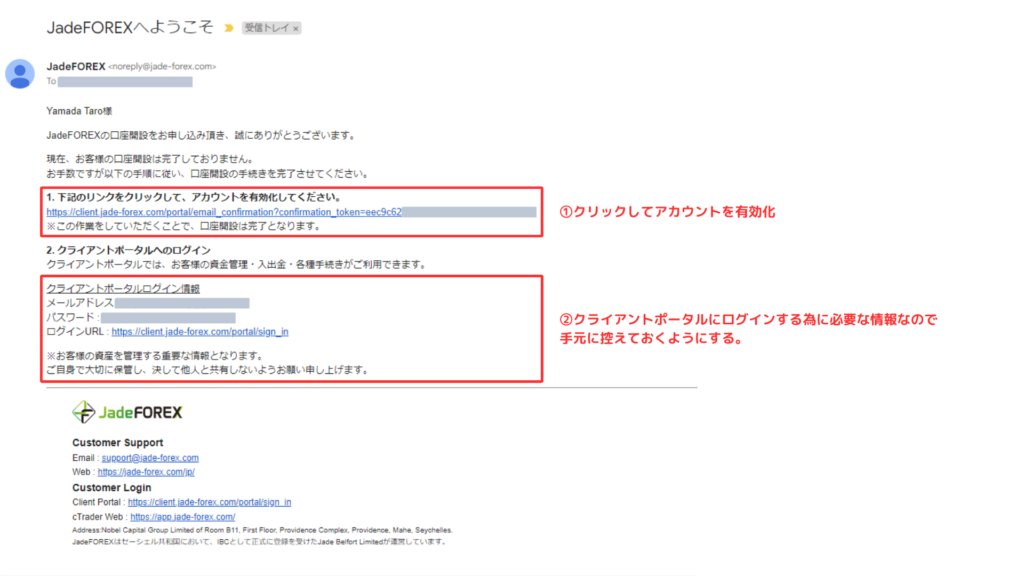 「JadeFOREXへようこそ」というメールが届いていますので、確認してみましょう。