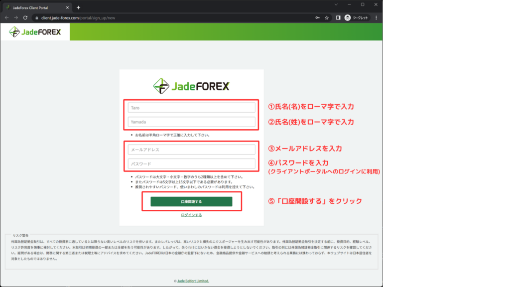 まずはこちらからJadeFOREXの口座開設ページを開きましょう。