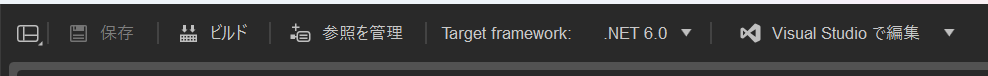 エディター上部のバーにはいくつかのボタンとメニューがあります。