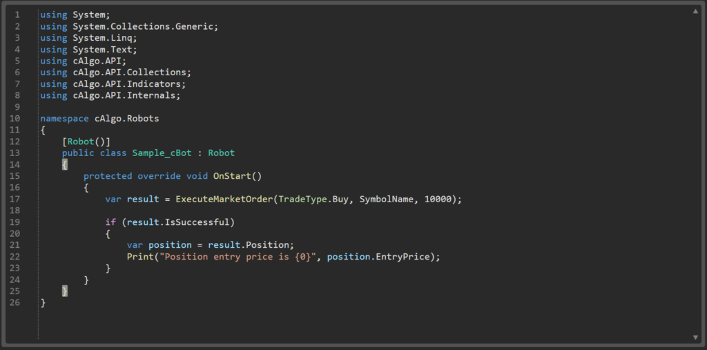 | 6 | var result = ExecuteMarketOrder(TradeType.Buy, SymbolName, 10000); |