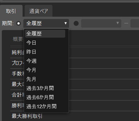 通貨ペアのリストは、1日からすべての時間までの標準的な期間でフィルタリングするか、最初と最後の日付を指定してカスタム期間を設定することができます。