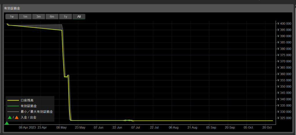 「有効証拠金」セクションは、口座残高と有効証拠金の相関関係を時間/残高チャート上に表示します。