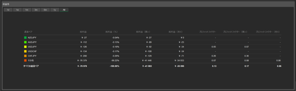 左上の期間ボタンを使って希望の期間に切り替えてください。勝ちトレードは緑色のチャートで、負けトレードはオレンジ色で表示されます。