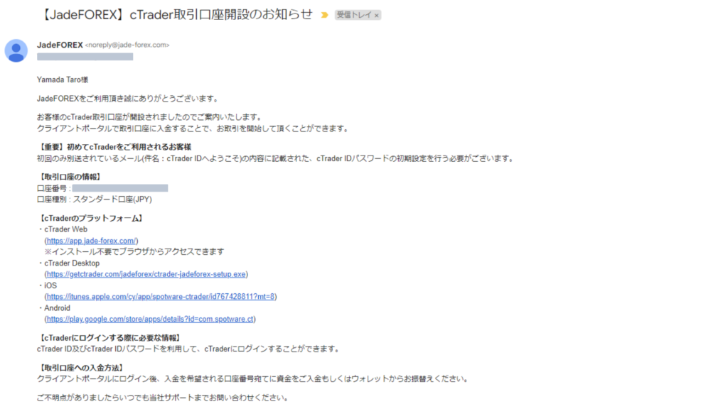 前回口座開設が完了した際に「【JadeFOREX】cTrader取引口座開設のお知らせ」という件名で下図のようなメールが届いているので確認してみましょう。
